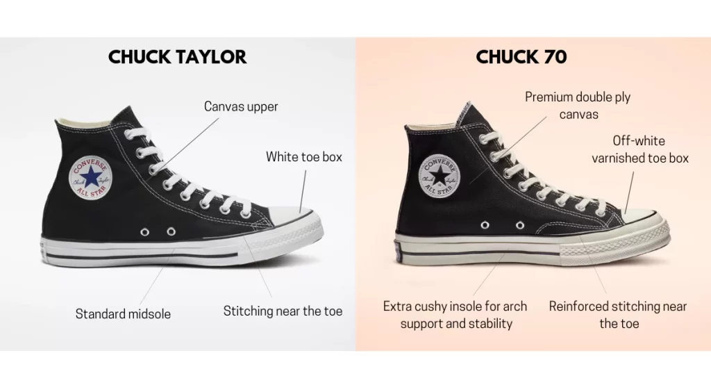 – دوخت کفش: دوخت کفش در Chuck 1970 نسبت به کانورس Classic بسیار تقویت شده و این ویژگی بیشتر در نوک کفش دیده میشود که باعث استحکام بیشتر کفش شده.